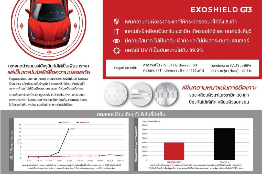EXOSHILED GT3 เป็นฟีล์มป้องกันกันสะเก็ดหินกระจกบานหน้า (“Windshield Protection Film”) ที่เป็นวัสดุเนื้อ PET เคลือบ Nano-Ceramic Hard Coat ที่เป็นลิขสิทธิ์เฉพาของทาง EXOSHIELD