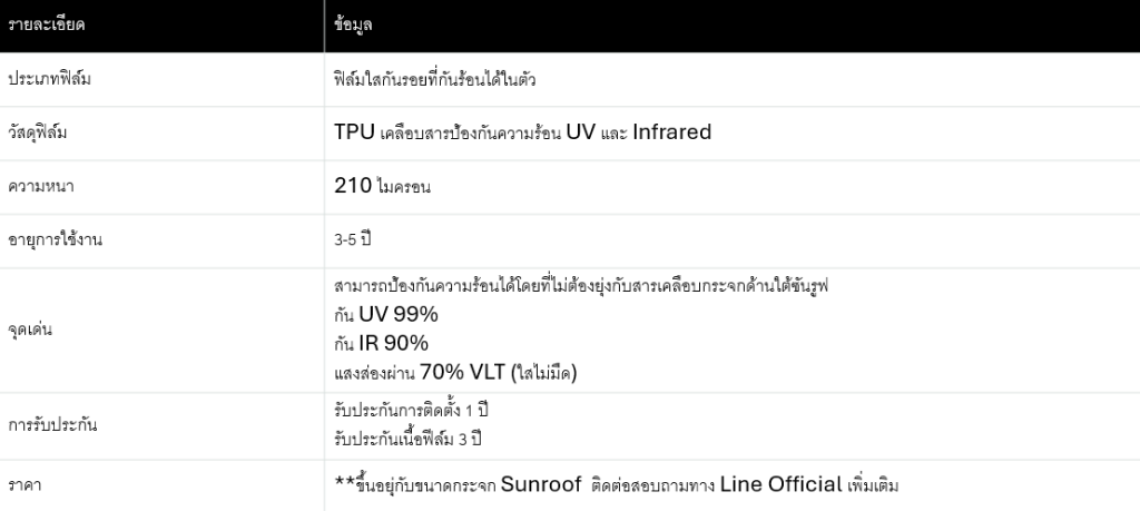 - ฟิล์มใสกันรอย เนื้อ TPU ที่ผสมสารเคลือบที่สามารถกันร้อน กัน UV และ Infrared ได้ในตัว ออกแบบมาสำหรับติด Sunroof/Moonroof โดยเฉพาะ