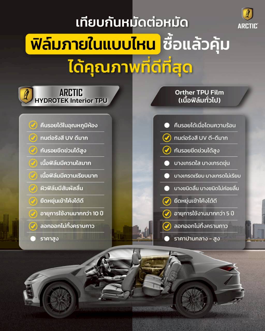 ARCTIC เข้าใจดีถึงสภาพอากาศและการใช้งานรถในประเทศไทย ฟิล์มของเราจึงถูกพัฒนาขึ้นมาเพื่อรองรับความต้องการของผู้ใช้รถในไทยโดยเฉพาะ ด้วยคุณสมบัติเด่นที่ตอบโจทย์การใช้งานจริง เช่น ลดการเกิดคราบน้ำ, ทนต่อขี้นกและสารเคมีต่างๆ, ปกป้องรถจากรอยขีดข่วน, และรักษาความเงางาม